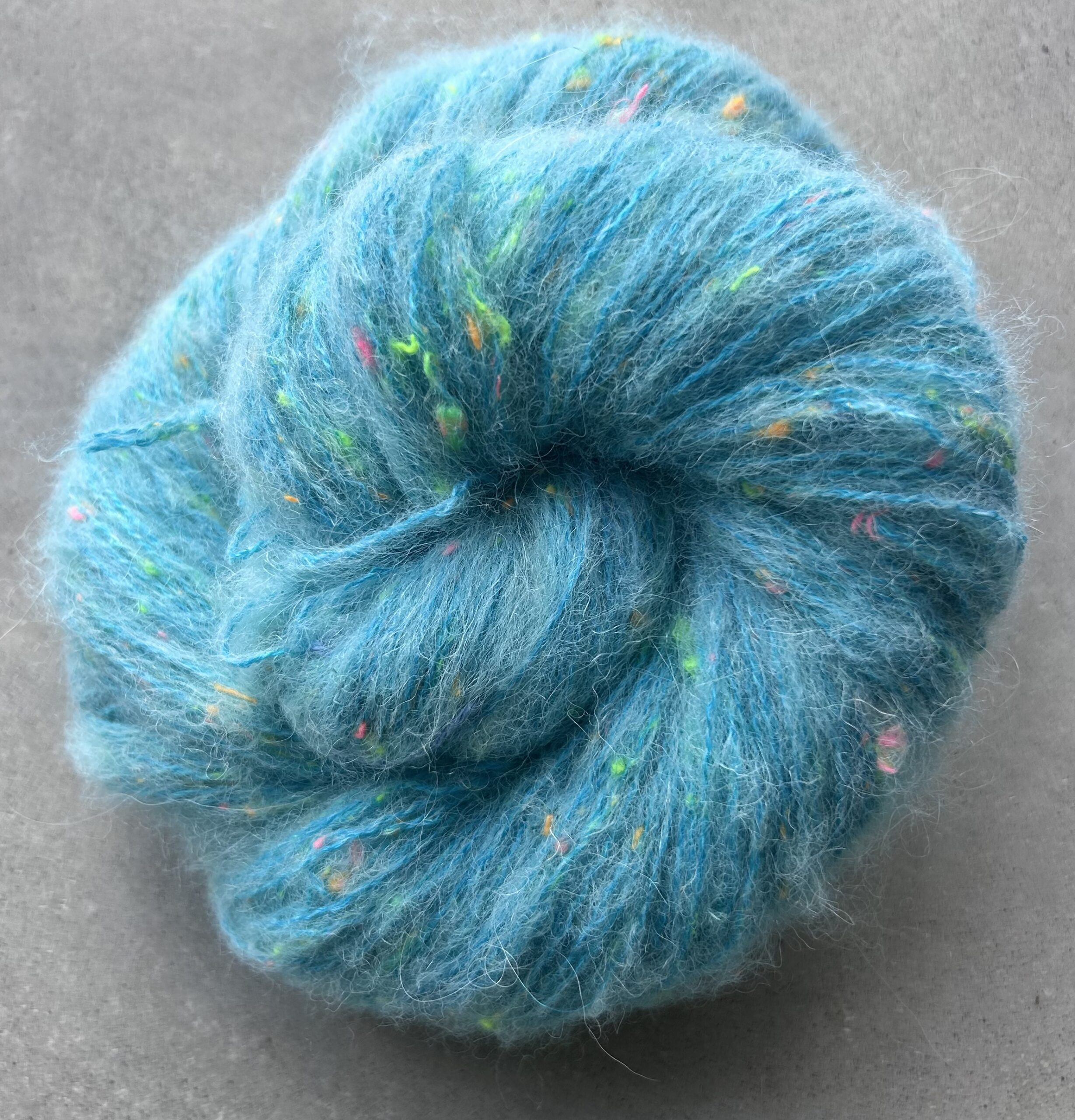 42% Superwash Merino, 32% Superfine Alpaca, 8% Linen, 18% Neon Donegal Nep