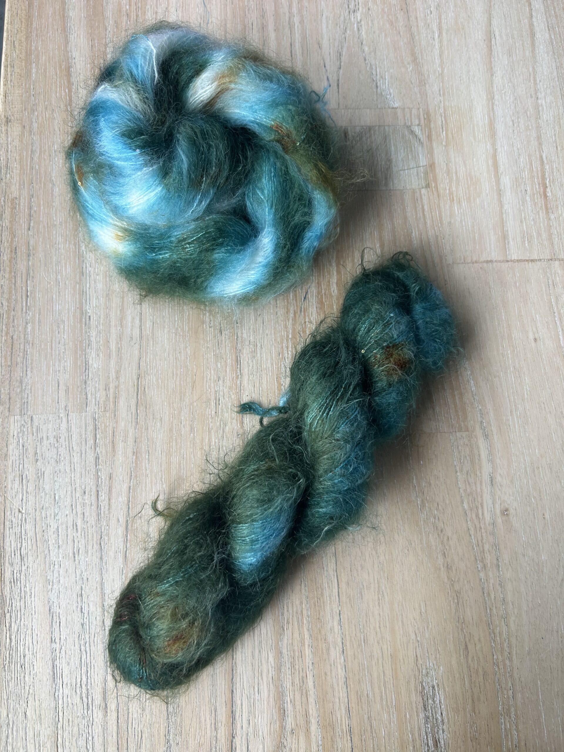 When knitted, it blocks beautifully and creates a floaty sparkly fabric which has an exquisite softness.